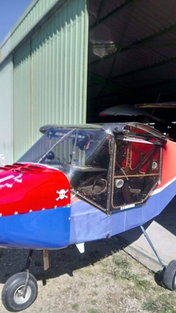 Ceci-dit il y a eu l’événement du pot d'échappement. Je vous explique : Un jour avec mon co-piloto Thierry, nous avions décidé de partir en direction de Roquecourbe. Quelques instants après le décollage, un fumée sympathique a envahi la cabine. Avec Thierry nous sommes restés très calme. Mais ça puait le brûlé. J'ai récupéré l'extincteur de bord, au cas où et nous sommes revenus tranquillou au point de départ. Au sol et après analyse du problème, il s’avère que nous avons perdu un morceau de l'échappement en plein vol. Pas de panique !!!!